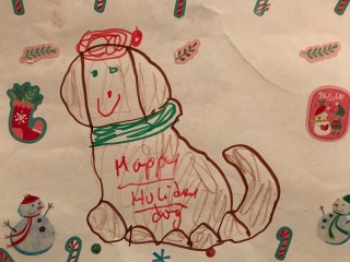 And then she came around to the back of my cart and smiled again, pointing at the picture she’d drawn with stickers surrounding it. “This is for you,” she said again, this time not so loudly. “This is your dog angel.” I looked down at the picture and stared. By the time I looked up, the woman was gone. Across the deli section, startling a mother with her teenager, smiling and handing her another picture she’d drawn. “Happy Holidays! This is for you…”