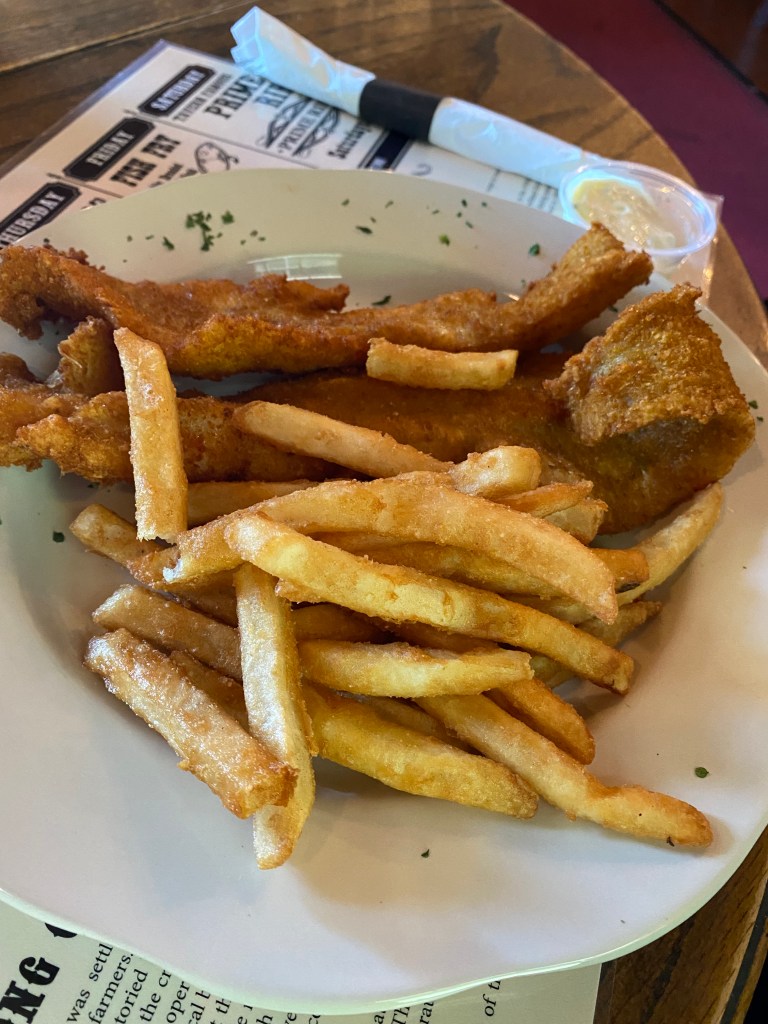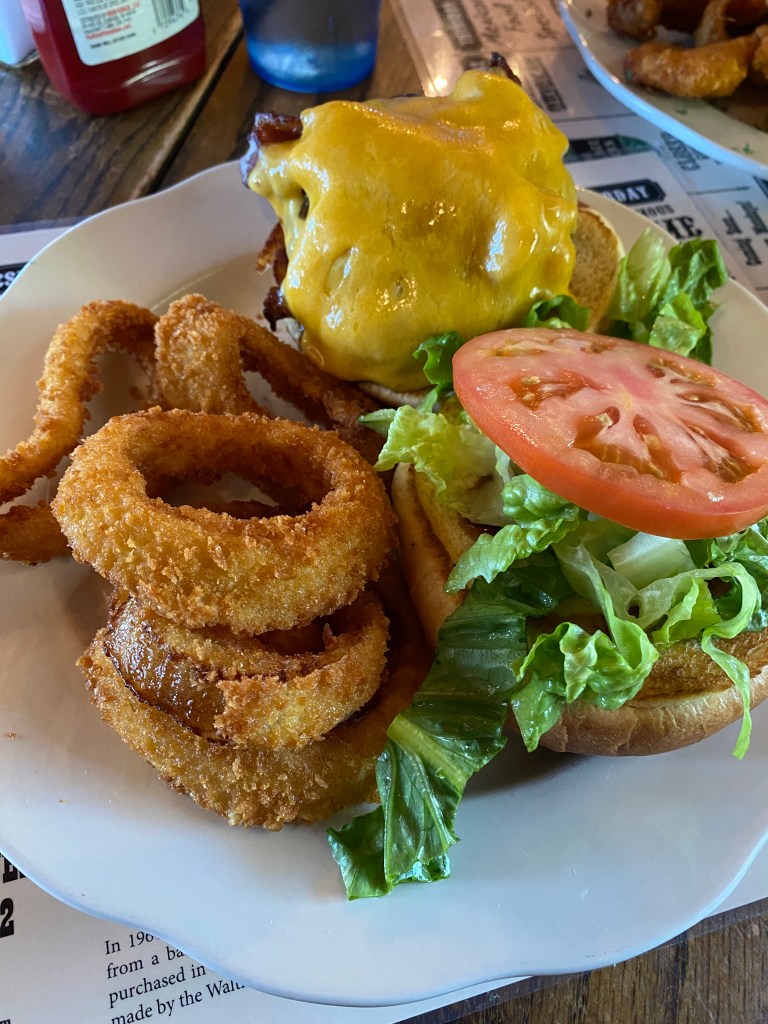 I selected a burger from the list of specials for my lunch, the Bourbon Burger, along with some steak cut onion rings, while el niño mayor selected one of his all-time favorites, the fish fry (though in our never-ending love for all things British, we tend to call it “fish n’ chips”). Between the fabulous service, the delicious burger, the eclectic ambience, and the peaceful post-lunch stroll across Buffalo Creek and past the covered iron truss bridge, I would call this first official stop on the Oldest Restaurant Quest quite a successful day and a worthwhile recommendation for those of you traveling near Long Grove, Illinois.
