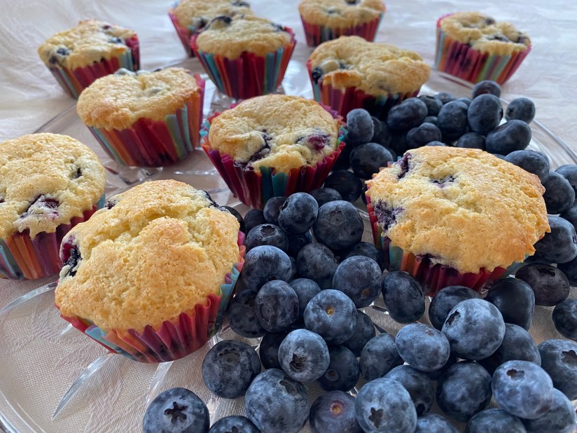 Alternate back and forth between adding the mix of dry ingredients and the ½ cup of milk until both are fully incorporated into the batter. Toss your 2 cups of blueberries with some flour (this helps to keep them from sinking to the bottom). You can use fresh or frozen blueberries, either works just fine. Fold the blueberries into the batter, then scoop an even amount of batter into muffin tins lined with papers.