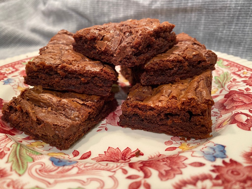 Bake the brownies for approximately 35 minutes (the 9×9 pan makes a thinner layer of brownies, so it may take just a few minutes less). Remove the brownies from the oven and let them cool in the pan before removing them to cut up and enjoy!