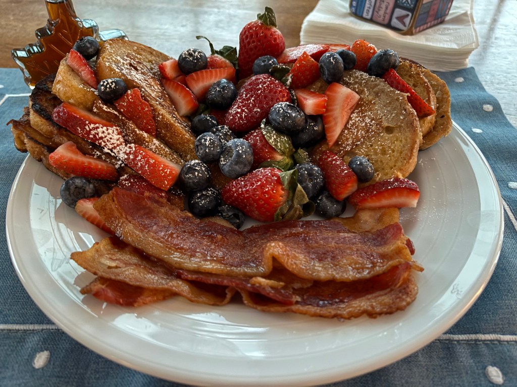 Remove the French toast slices to a plate and serve with sliced strawberries and blueberries. Sprinkle powdered sugar over the top. Serve with warmed pure maple syrup.