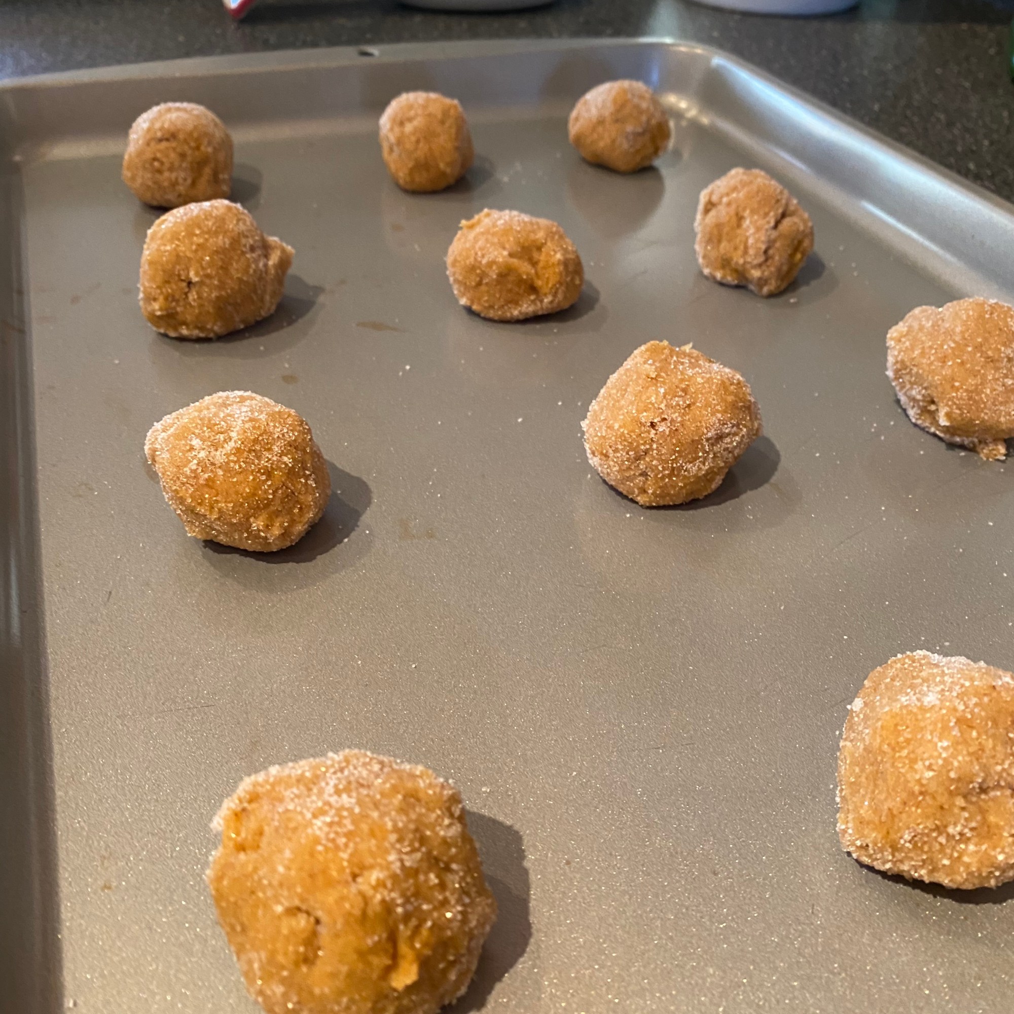 Preheat the oven to 375 degrees. Roll tablespoons of dough into the bowl of sugar. Place two inches apart on an ungreased cookie sheet and bake for 8-10 minutes.