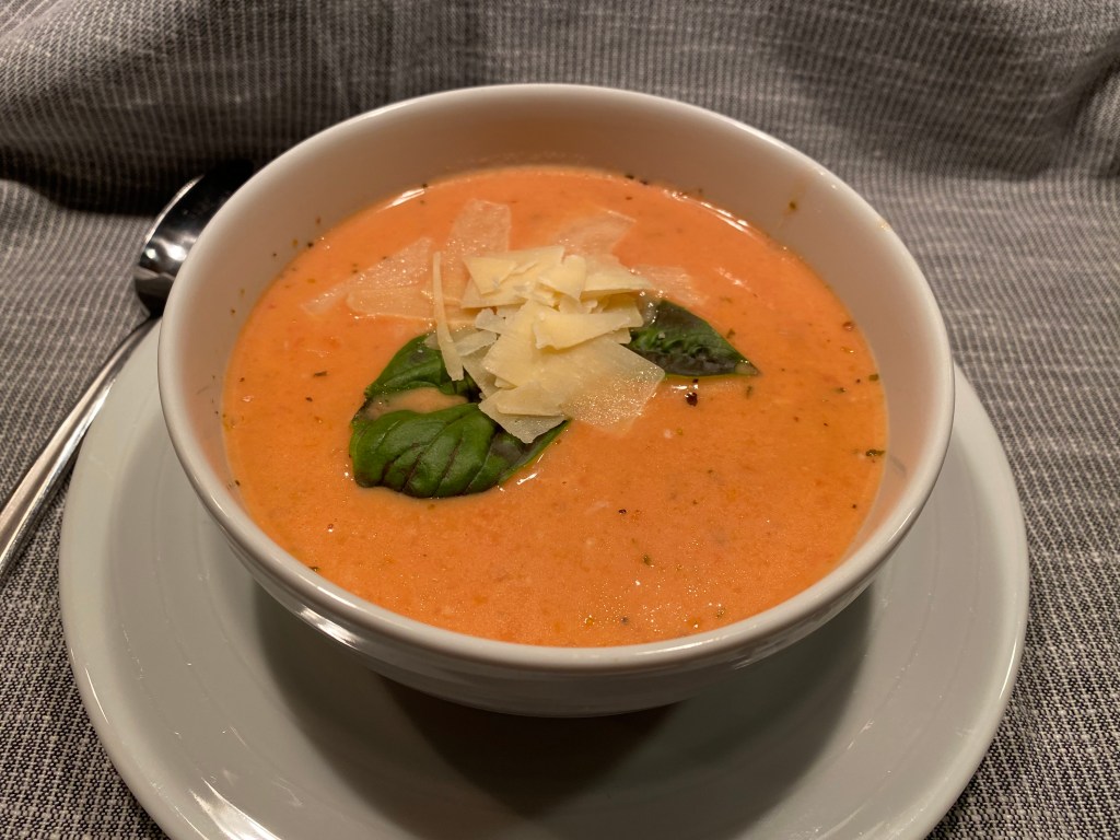 Whisk in broth and cook, stirring constantly until mixture thickens. Stir in tomatoes and heavy cream. Use an immersion blender and blend the soup until it’s pretty much smooth. Keep the heat low.